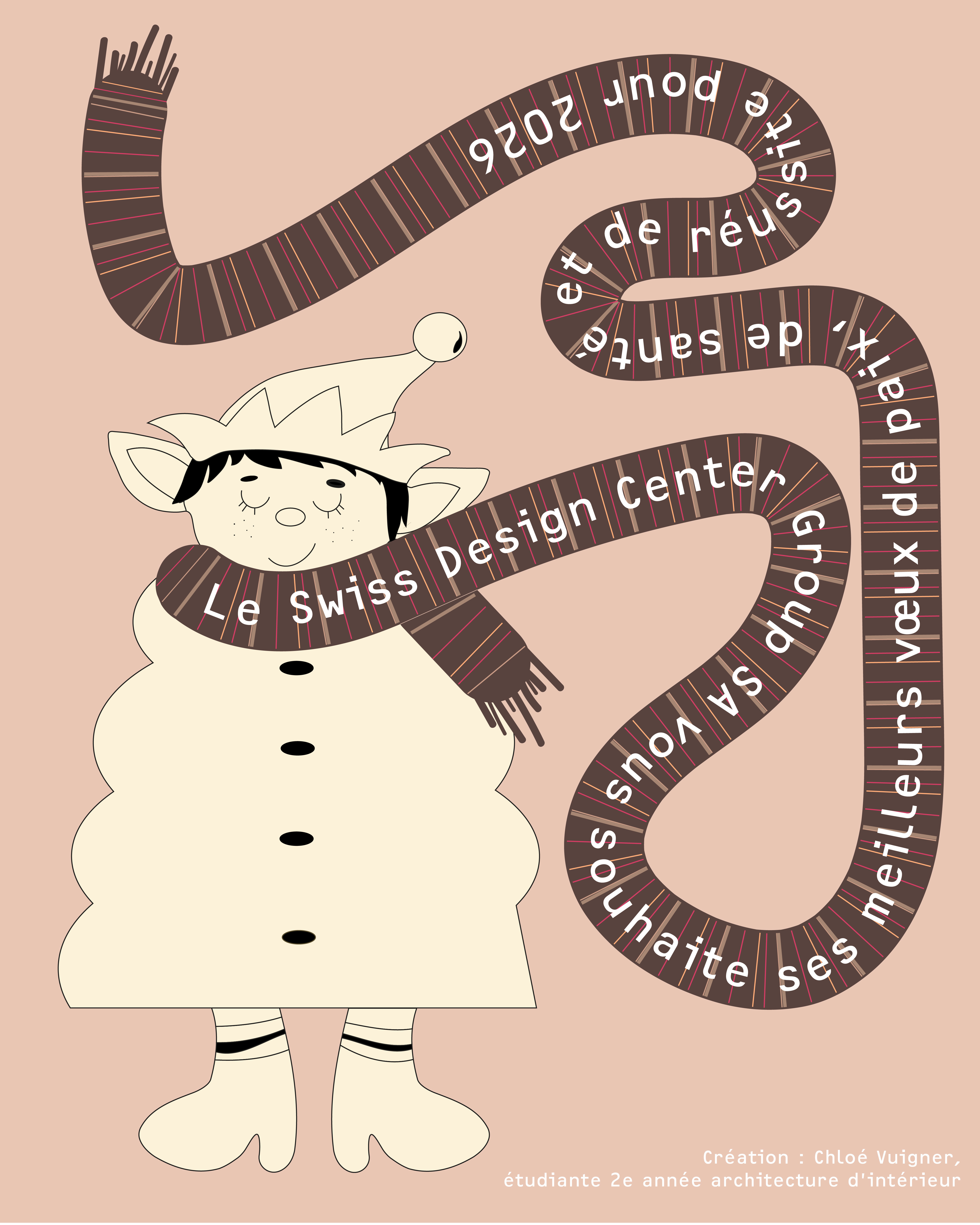 Pour illustrer ces vœux, l’école a choisi de mettre à l’honneur le travail de Chloé Vuigner, étudiante au Swiss Design Center. Sa carte de vœux a été réalisée dans le cadre du cours Adobe, en deuxième année section architecture d'intérieur.