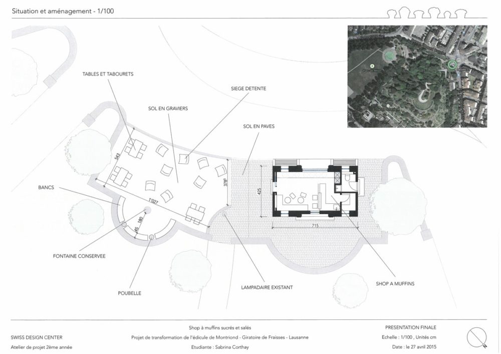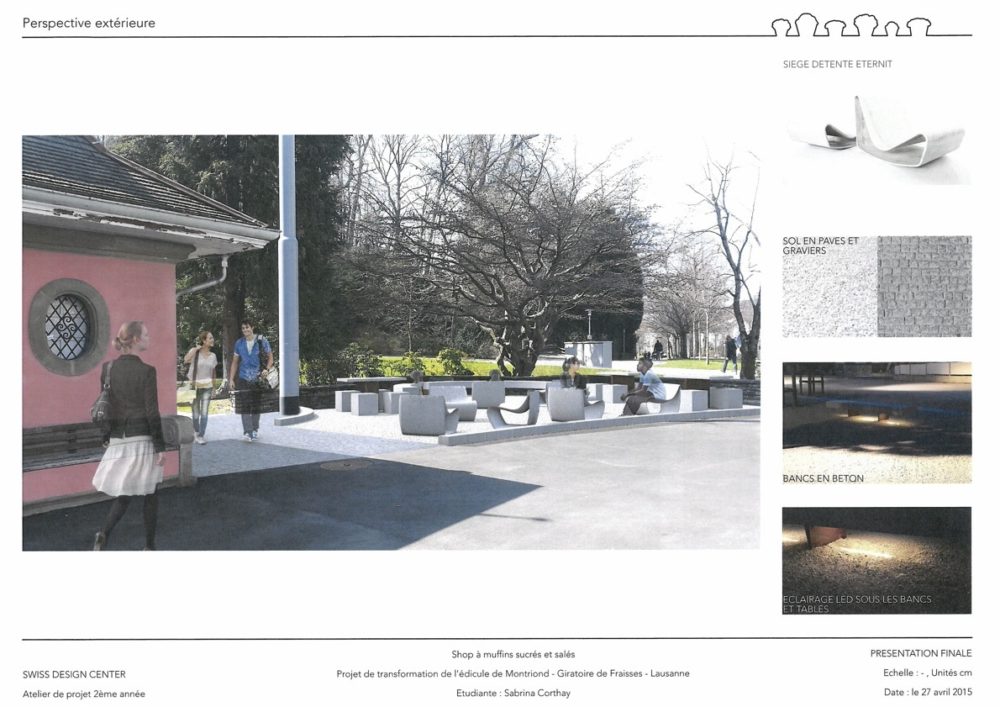 Ce projet a pour but de transformer l'édicule de Montriond en espace commercial dédié à la petite restauration gourmande sur place et à l'emporter. Les façades ainsi que la toiture ne doivent pas être modifiées, seulement restaurées. Seul les portes et les fenêtres peuvent être rénovées, ainsi que la couleur de la façade. Les éléments en fer forgé et les bancs doivent être conservés.